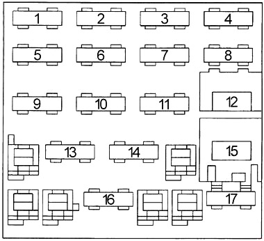 Wyłącznik obwodu: akcesoria elektryczne (1982-1983), odmgławiacz tylnej szyby, elektryczne zamki drzwi, elektryczne fotele, tylna spryskiwacz/wycieraczka (1985-1990), zwalnianie klapy tylnej (1985-1986) |
