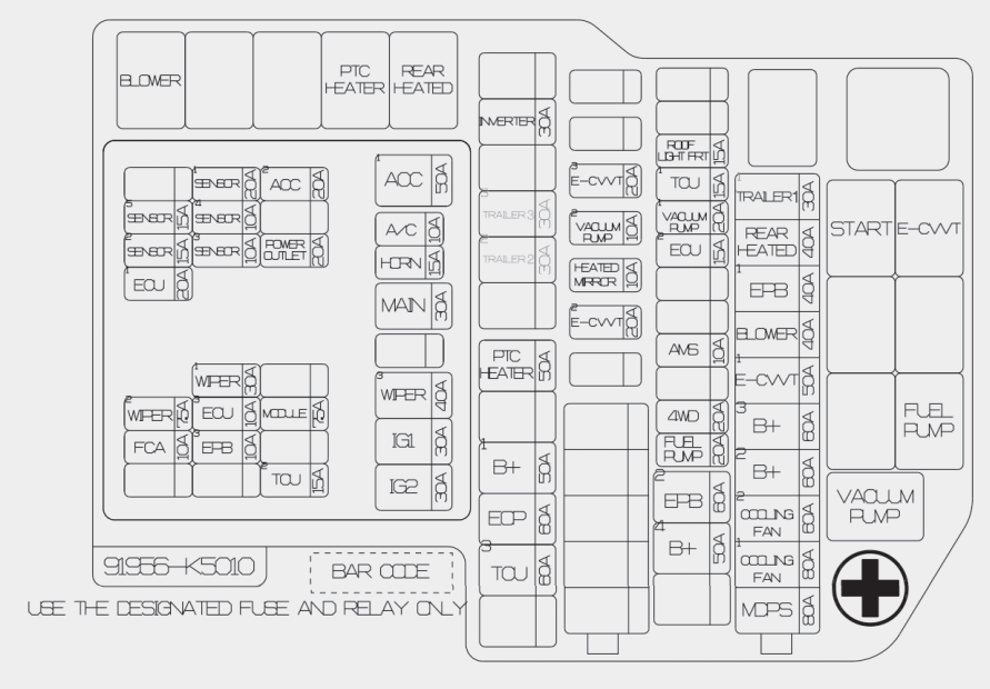 Przełącznik świateł awaryjnych, elektromagnes kluczyka, przełącznik Crash Pad, złącze łącza danych, czujnik deszczu, inteligentny kluczyk kierowcy/pasażera na zewnątrz uchwytu, przełącznik trybu sportowego, blok przyłączeniowy E/R (przekaźnik E-CVVT) |