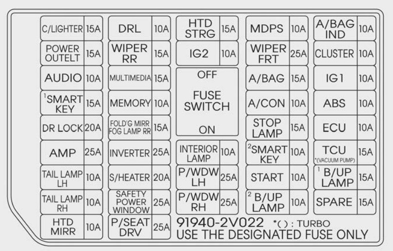 2 SENSOR (T-GDI) 10 A Czujnik tlenu (góra)/(dół), zawór zamykający pochłaniacz, zawór recyrkulacji, zawór odcinający, zawór elektromagnetyczny sterowania oczyszczaniem, skrzynka bezpieczników i przekaźników w komorze silnika (przekaźnik wentylatora chłodzącego (wysoki))