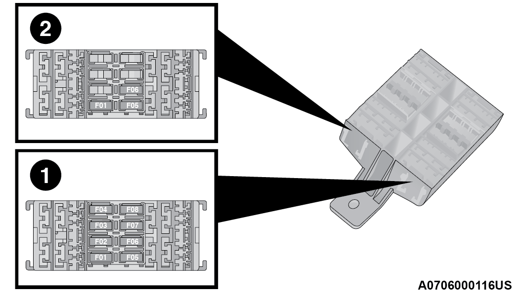 Bezpieczniki mogą być umieszczone w dwóch jednostkach. uchwyt bezpiecznika nr 1 i uchwyt bezpiecznika nr 2 (jeśli jest wyposażony w holowanie przyczepy) znajdują się najbliżej tyłu pojazdu.