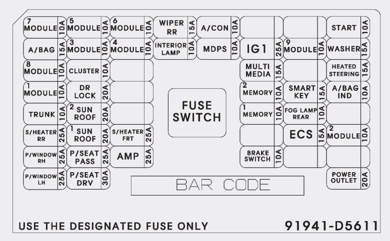 MODULE 5 10 A Moduł sterujący klimatyzacji, lusterko elektrochromowe, przełącznik Crash Pad, lampa przednia po lewej i prawej stronie, moduł automatycznego poziomowania lamp przednich, jednostka główna A/V i nawigacji, pokrywa wlewu paliwa i przełącznik otwierania bagażnika, wskaźnik dźwigni zmiany biegów, moduł IMS kierowcy, Moduł IMS kierowcy, moduł sterujący przedniego siedzenia wentylacyjnego, moduł sterujący podgrzewania przedniego siedzenia, moduł sterujący ogrzewania tylnego siedzenia