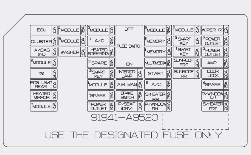 B+2 50A Inteligentny blok przyłączeniowy (urządzenie automatycznego wyłączania prądu upływowego, bezpiecznik – P/SEAT DRV, P/WDW RH), ogrzewanie tylnych siedzeń, lampa wewnętrzna, multimedia, pamięć