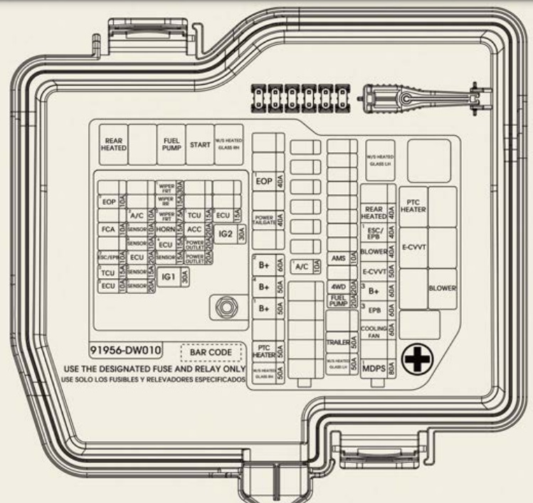 Moduł sterujący IMS (zintegrowany system pamięci) sterownika, moduł sterujący przedniego siedzenia wentylacyjnego, AMP (wzmacniacz), moduł sterujący podgrzewania przedniego siedzenia, jednostka główna audio/wideo i nawigacji, przednia ładowarka bezprzewodowa, kontroler klimatyzacji (LCD), Moduł sterujący klimatyzator, elektrochromowe lustro, niskonapięciowa przetwornica DC-DC, złącze łącza danych |