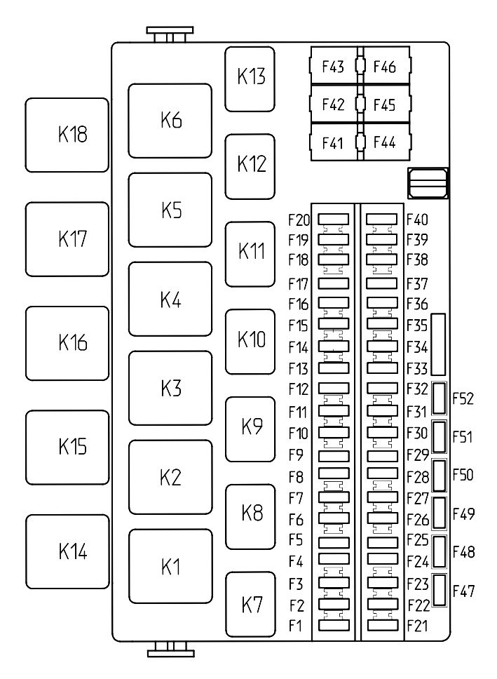 | Podany zestaw bezpieczników dla wersji high line «luxe» (w zależności od zestawu opcji niektóre bezpieczniki z tego zestawu nie mogą być stosowane w innych wersjach). |
