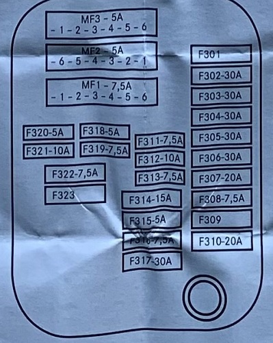 Skrzynka bezpieczników w przedziale pasażerskim (lewa strona deski rozdzielczej)