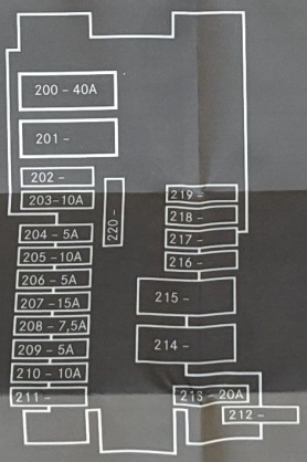 Skrzynka bezpieczników w przedziale pasażerskim (lewa strona deski rozdzielczej)
