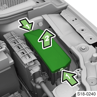 • Jednocześnie naciśnij przyciski blokujące na pokrywie skrzynki bezpieczników i zdejmij pokrywę.