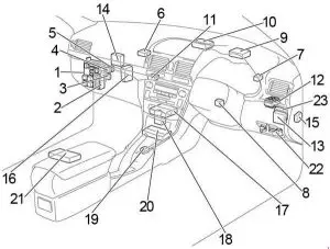 Bezpieczniki „ECU-B NO.2”, „DOME”, „RAD NO.2” |
